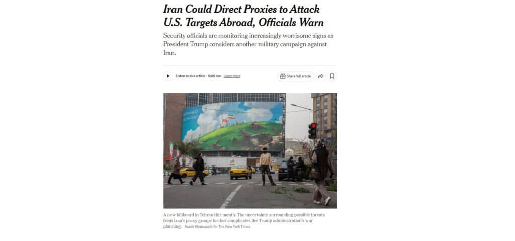 «Το Ιράν θα μπορούσε να στείλει τους πληρεξουσίους του (proxies) για να διεξαγάγουν τρομοκρατικές επιθέσεις αντιποίνων κατά αμερικανικών στόχων στην Ευρώπη, τη Μεσόγειο και τη Μέση Ανατολή, εάν ο Πρόεδρος Trump διατάξει πλήγματα μεγάλης κλίμακας κατά του Ιράν», σημειώνει το δημοσίευμα.