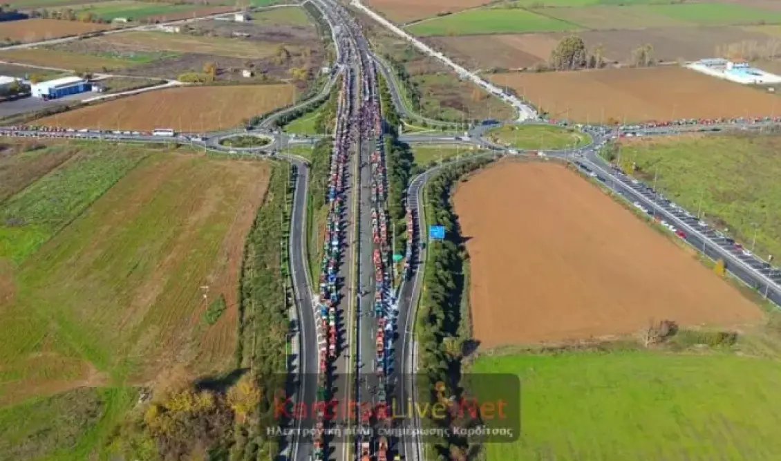 Από αέρος, το εντυπωσιακό κομβόι αποτυπώθηκε σε βίντεο της Αερολέσχης Νομού Καρδίτσας, δείχνοντας το μέγεθος της κινητοποίησης. Την ίδια ώρα, κλούβες των ΜΑΤ είχαν αποκλείσει τις εισόδους και τις εξόδους του ανισόπεδου κόμβου του αυτοκινητόδρομου, σε μια προσπάθεια –που δεν απέδωσε– να εμποδίσουν τους διαδηλωτές να φτάσουν στο σημείο.