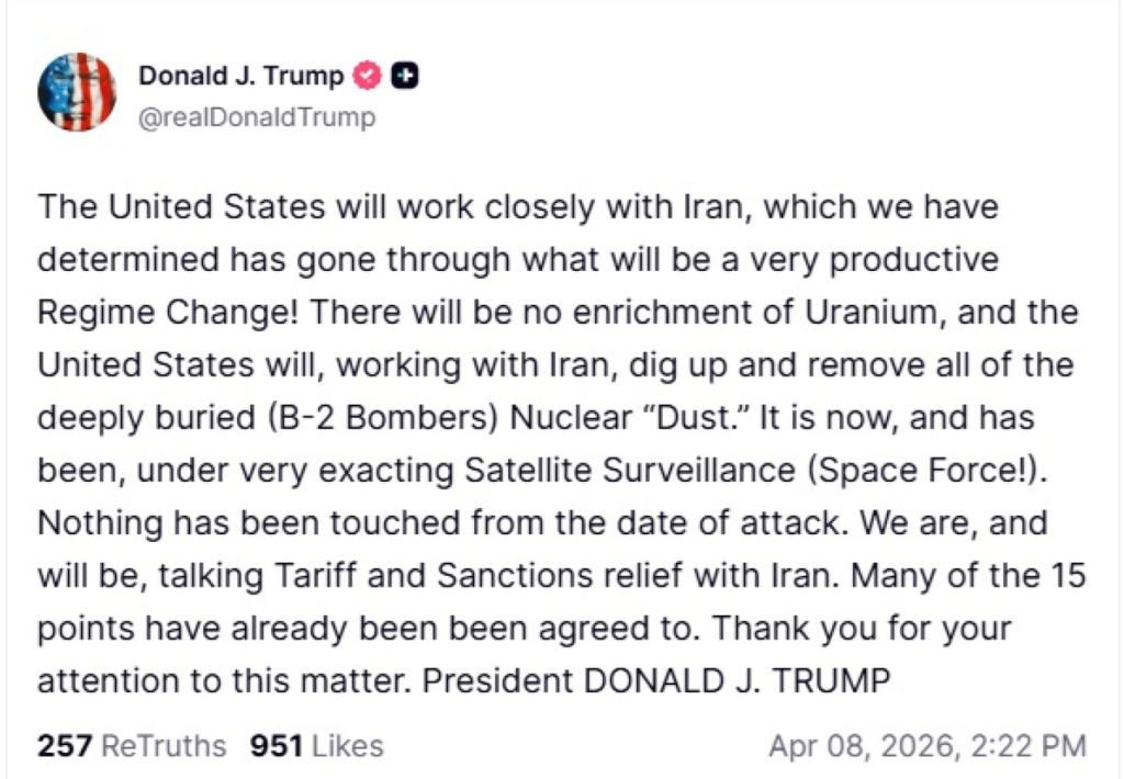 Ο Ντόναλντ Τραμπ ανέφερε σε ανάρτησή του ότι οι Ηνωμένες Πολιτείες σκοπεύουν να συνεργαστούν στενά με το Ιράν, υποστηρίζοντας ότι οι ΗΠΑ έχουν διαπιστώσει ότι η Τεχεράνη έχει περάσει από «μια αλλαγή καθεστώτος που θα αποδειχθεί εξαιρετικά παραγωγική».