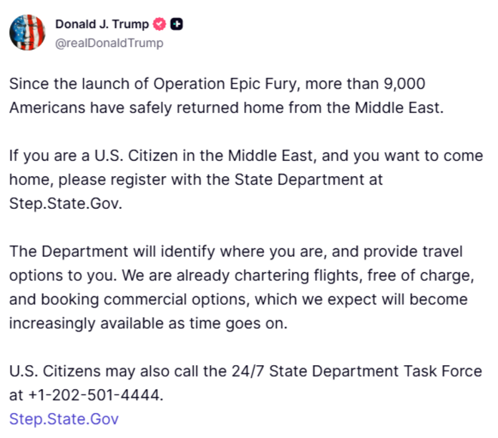 «Από την έναρξη της επιχείρησης «Επική Οργή», περισσότεροι από 9.000 Αμερικανοί έχουν επιστρέψει με ασφάλεια στις Ηνωμένες Πολιτείες από τη Μέση Ανατολή».