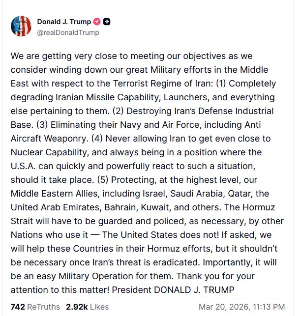 Τα Στενά του Ορμούζ θα πρέπει να φυλάσσονται και να ελέγχονται, όπως απαιτείται, από άλλα έθνη που το χρησιμοποιούν — οι Ηνωμένες Πολιτείες δεν τα χρησιμοποιούν! Εάν μας ζητηθεί, θα βοηθήσουμε αυτές τις χώρες στις προσπάθειές τους στο Ορμούζ, αλλά αυτό δεν θα πρέπει να είναι απαραίτητο μόλις εξαλειφθεί η απειλή του Ιράν. Είναι σημαντικό να σημειωθεί ότι θα είναι μια εύκολη στρατιωτική επιχείρηση για αυτές.