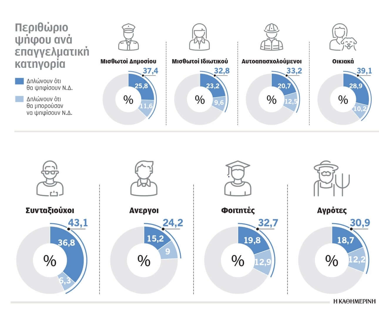 Αντίθετα, οι δύο πιο δυνατές κατηγορίες για το κυβερνών κόμμα είναι οι συνταξιούχοι και οι νοικοκυρές. Καλή κατηγορία είναι επίσης για τη ΝΔ και οι δημόσιοι υπάλληλοι.
