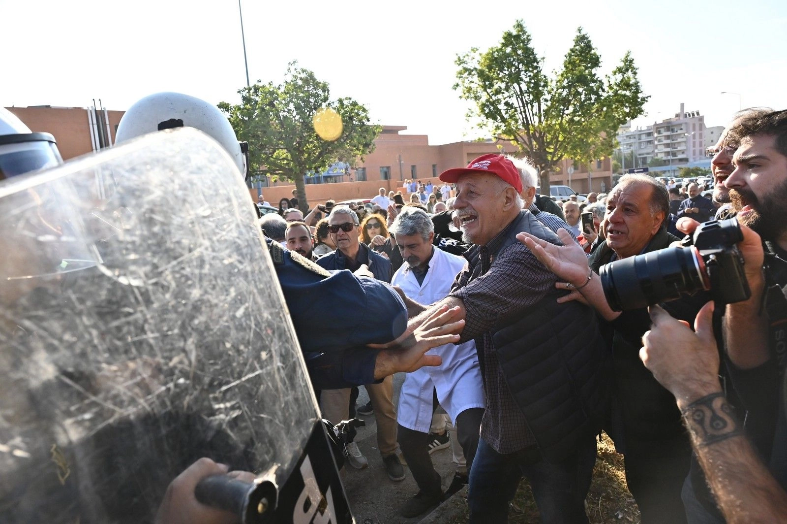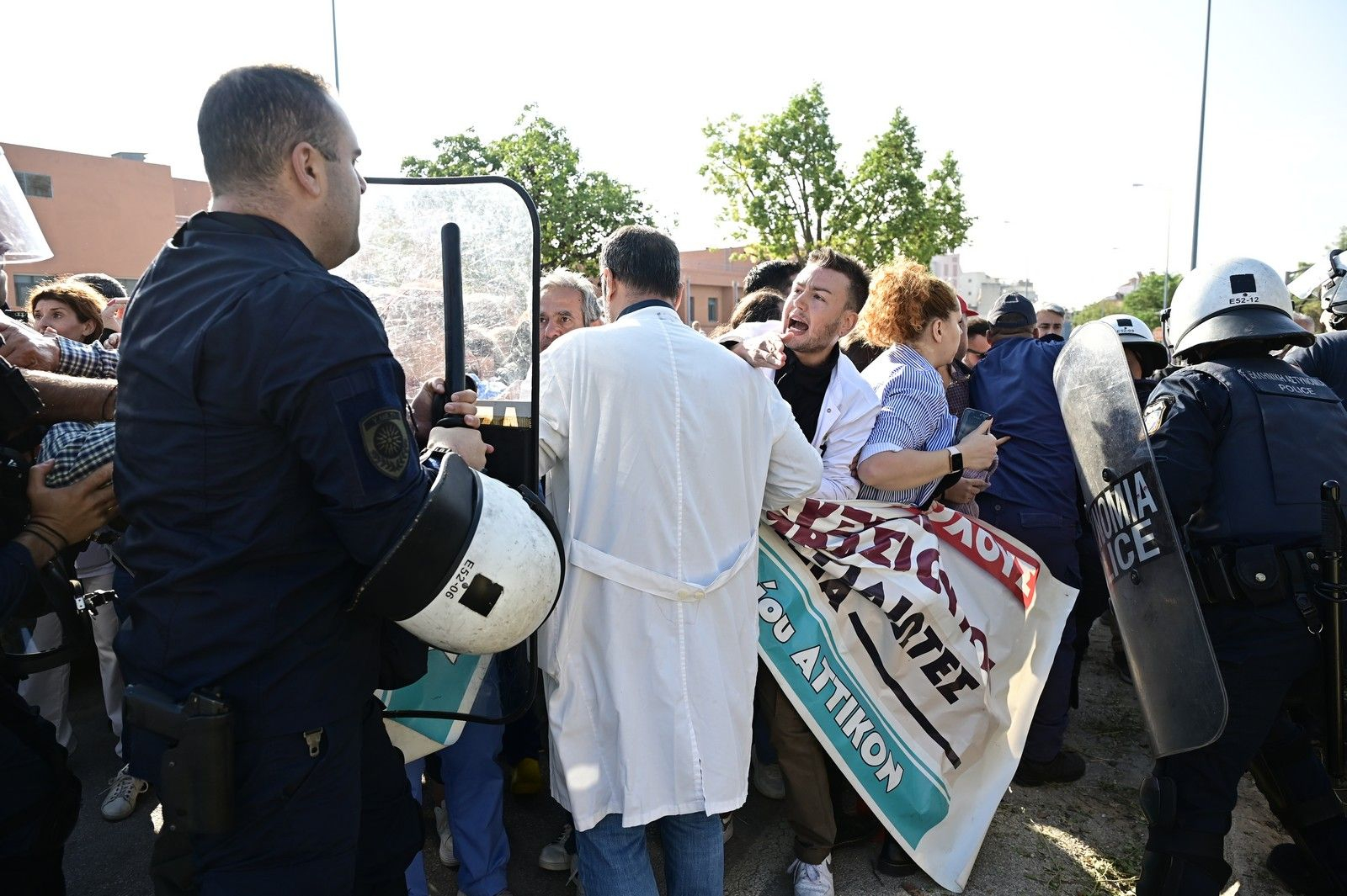 Από νωρίς, ισχυρές αστυνομικές δυνάμεις — ΜΑΤ, ΟΠΚΕ, ΔΙΑΣ και ΥΜΕΤ — είχαν παραταχθεί έξω από το νοσοκομείο. Όταν οι εργαζόμενοι επιχείρησαν να πλησιάσουν για να διαμαρτυρηθούν, οι αστυνομικοί προχώρησαν σε χρήση χημικών και απώθηση με γκλομπ, προκαλώντας ένταση και πανικό στον χώρο.